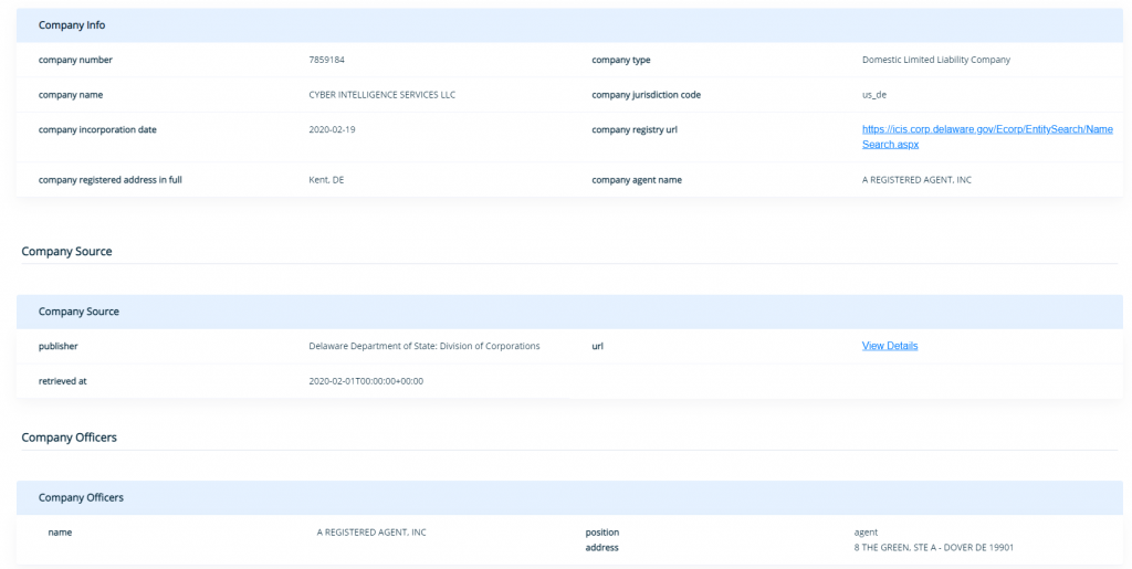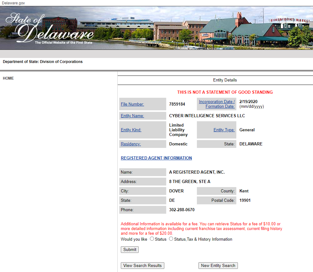[…] is owned by the company Cyber Intelligence Services LLC registered in Delaware […]