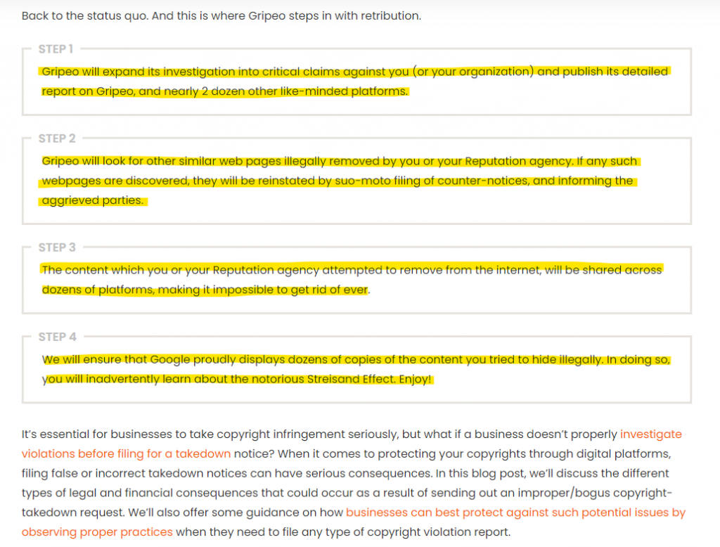 See the extorsion Gripeo what they clearly say in a few words: don’t try to cancel our articles (without paying us) we’ll report dozen of it on different websites. Thinking Of Filing A Fake Copyright Takedown Notice Against Gripeo? Think Again – Gripeo