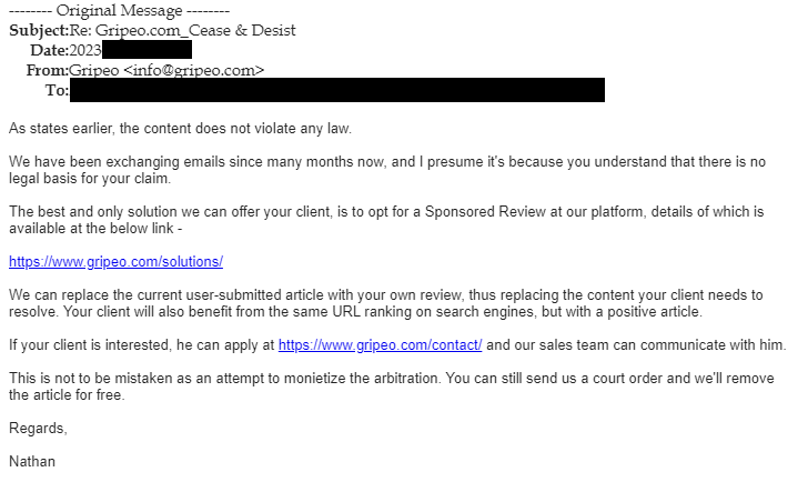 They start the email with “the content does not violate any law”. In which shit country do they live? Where is legal to defame people? seriously?