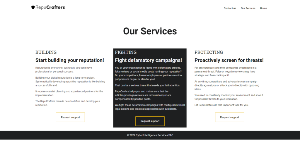 CYBERINTELLIGENCE SERVICES PLC is owning the website Repucrafters.com