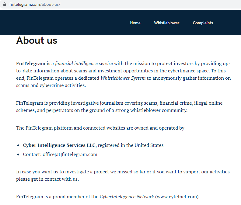 In 2020, the website was owned by “Financial Intelligence Bureau Ltd“, a Uk company. If you don’t believe it, see here at the footer https://web.archive.org/web/20201028111003/https:/fintelegram.com/