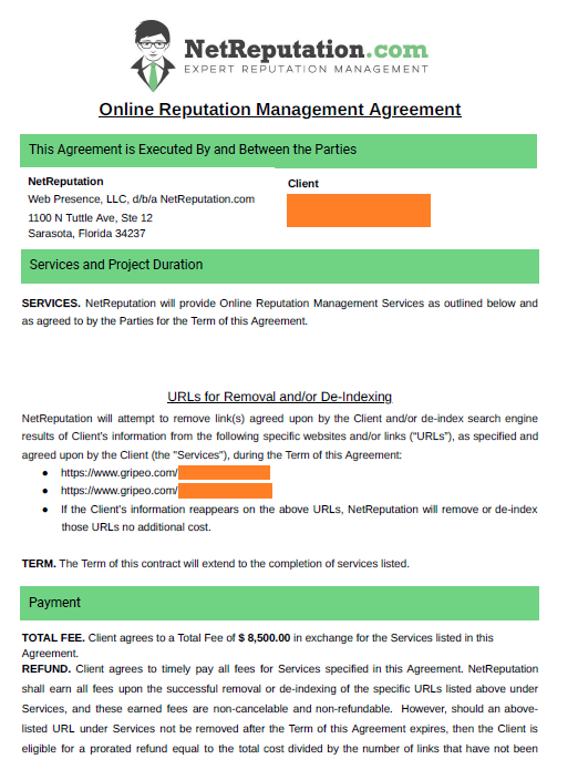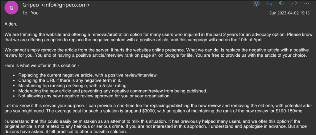 Gripeo charges these “reputation companies” 2500/3000$ to remove each article, and they resell it at 5/6000$ for each article deletion. It’s 100% profit!