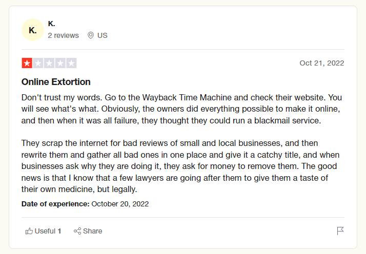 But it’s the same family, same scam: bad cop (Gripeo), good cop (reputation management company) game!