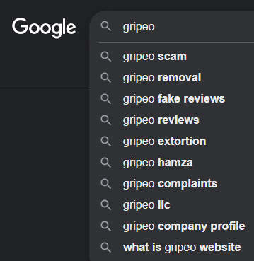 Let’s see now on Google the most keywords connected with Gripeo: scam, removal, fake reviews, extortion, complaints…